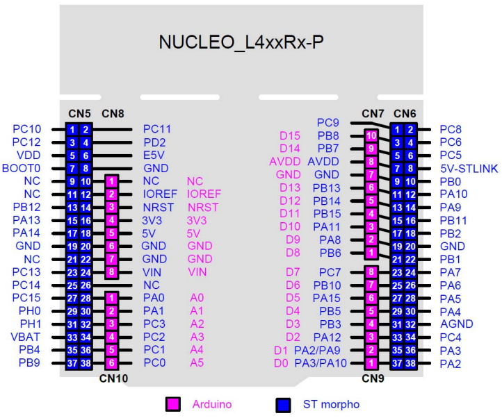 Nucleo L412RB-P Board has 5 GPIO controllers (Ports A, B, C, D and H). These controllers are responsible for pin muxing, input/output, pull-up, etc.