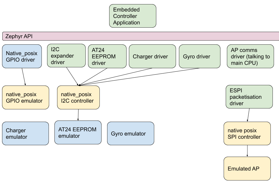 Using the above framework we can test an entire application (e.g. Embedded Controller) on native_posix using emulators for all non-chip drivers: