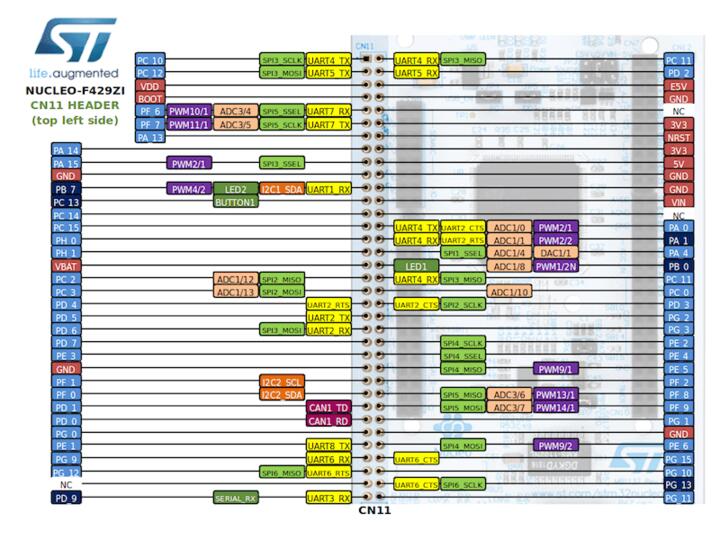 The Nucleo F429ZI Board has 8 GPIO controllers. These controllers are responsible for pin muxing, input/output, pull-up, etc.