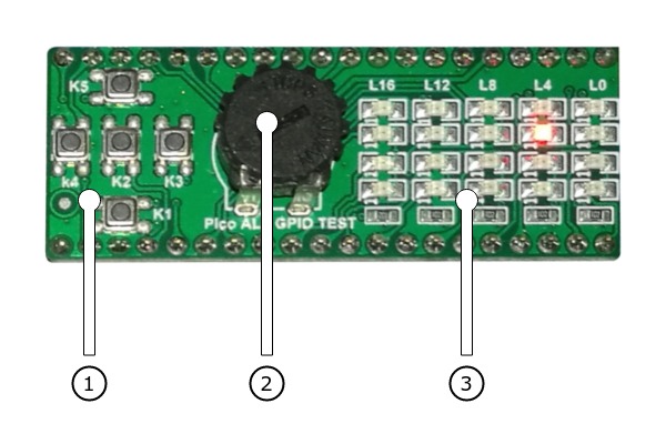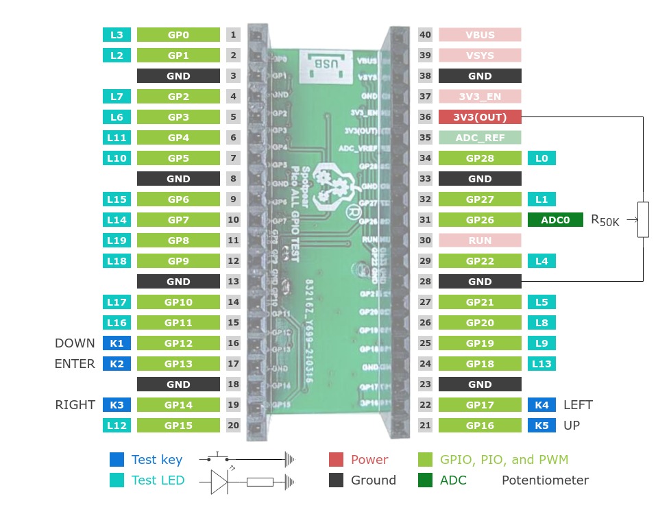The Spotpear Pico ALL GPIO TEST [1] shield is one of the simplest boards for testing all I/O signal lines of a Raspberry Pi Pico by GPIO or PWM functions. There is also one additional ADC channel for testing purposes directly connected to a simple high-resistance potentiometer.