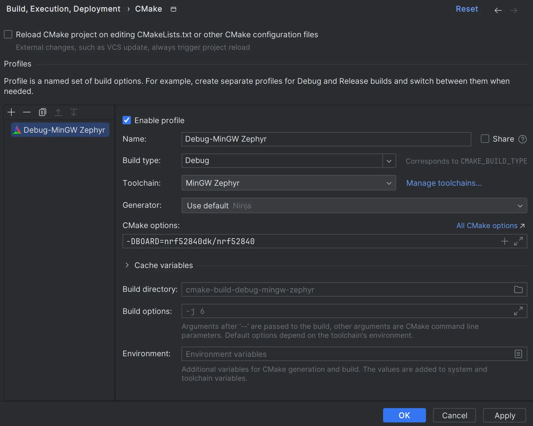 Back in the CMake profile settings dialog, specify your board in the CMake options field. For example:
