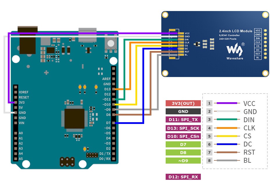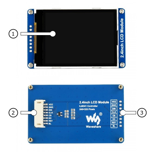 The Waveshare LCD modules are available in different sizes and resolutions. Nearly all displays comes with a special LCD controller wired over SPI up to the board by free wiring.