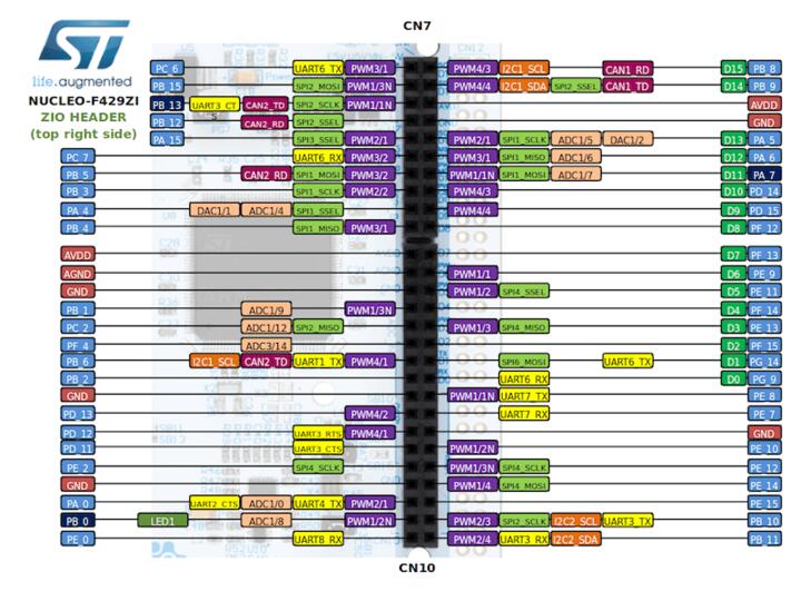 The Nucleo F429ZI board features a ST Zio connector (extended Arduino Uno V3) and a ST morpho connector. Board is configured as follows