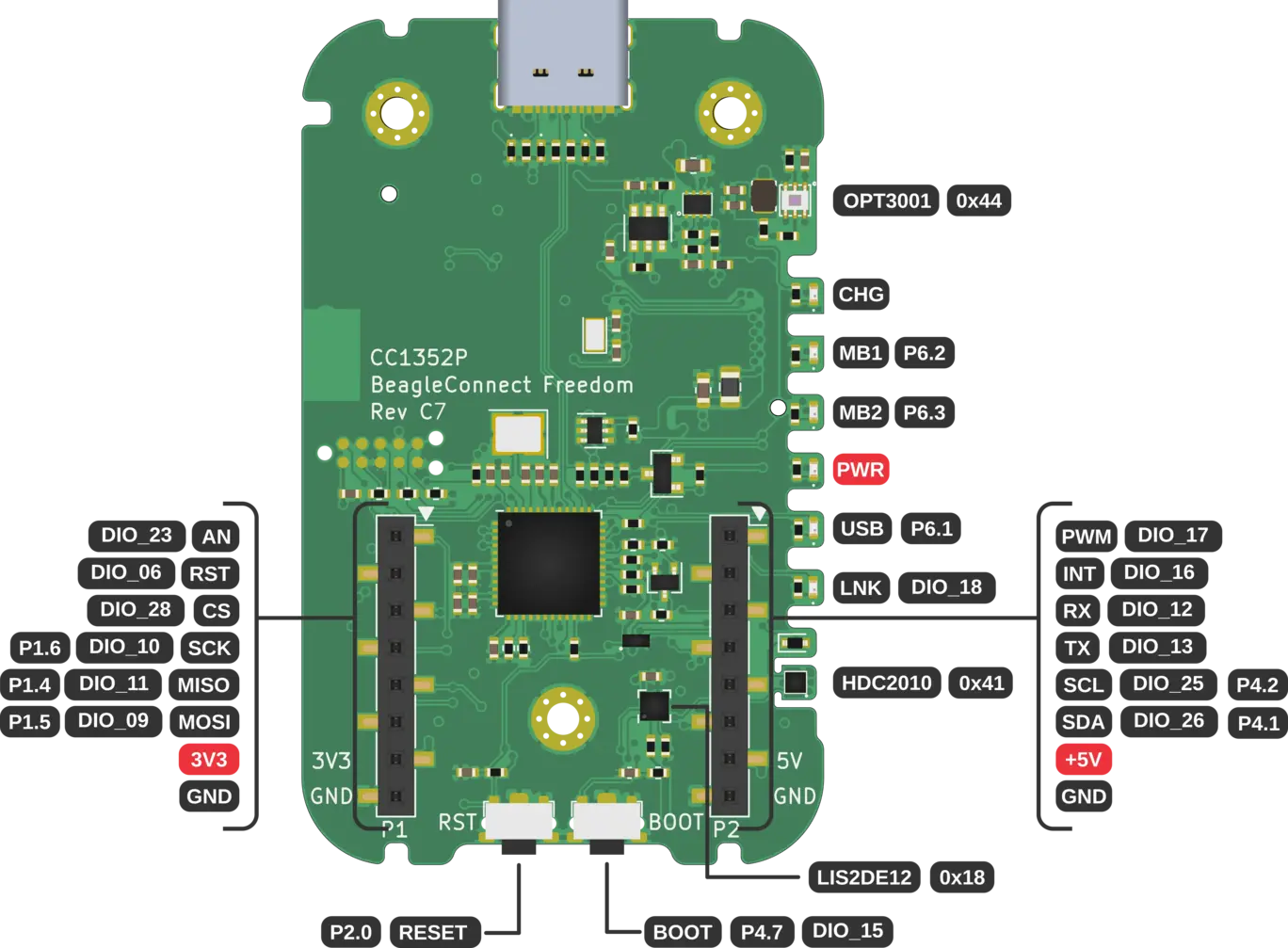 BeagleBoard.org BeagleConnect Freedom is a wireless Internet of Things board based on the SimpleLink multi-Standard CC1352P7 wireless MCU.
