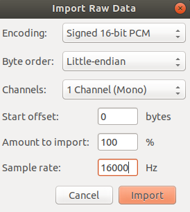 Use the ‘Import->Raw Data’ menu to load the sound.raw file as signed 16 bit PCM, Little Endian, mono format @16KHz:
