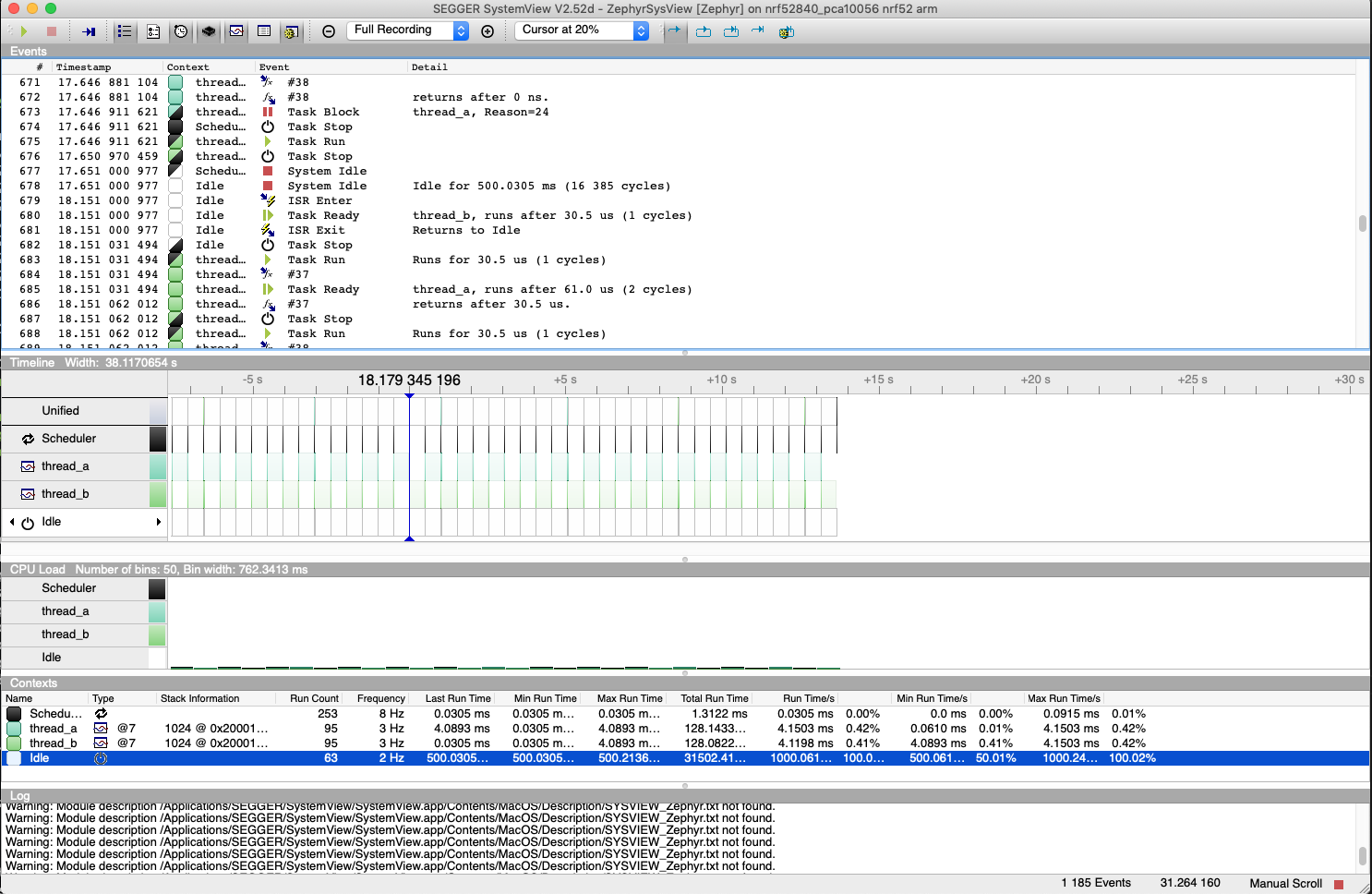 Zephyr kernel events are captured automatically when Tracealyzer tracing is enabled. Tracealyzer also provides extensive support for application logging, where you call the tracing library from your application code. This lets you visualize kernel events and application events together, for example as data plots or state diagrams on logged variables. Learn more in the Tracealyzer User Manual provided with the application.