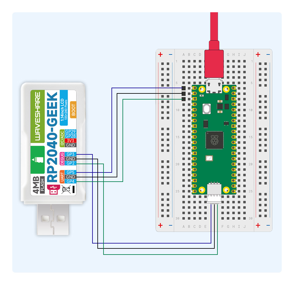 The RP2040 Geek is an RP2040 development board for geeks, housed in a special case and ready to build your own Picoprobe [7] USB-to-SWD and UART bridge. The on-board USB-A connector makes it usable on any host computer. The two dedicated on-board 3-pin SWD port and 3-pin UART port are compatible to the original Raspberry Pi Debug Probe [8]. For more details read the Raspberry Pi 3-pin Debug Connector Specification [9]. An additional 4-pin IO port with I2C or ADC pins can be used for testing target boards.