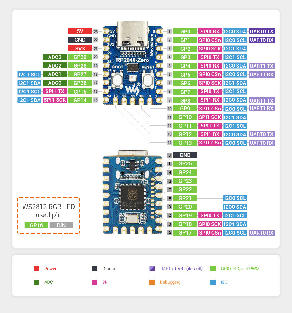 Similar to the Raspberry Pi Pico the Waveshare RP2040 board configuration supports the following hardware features: