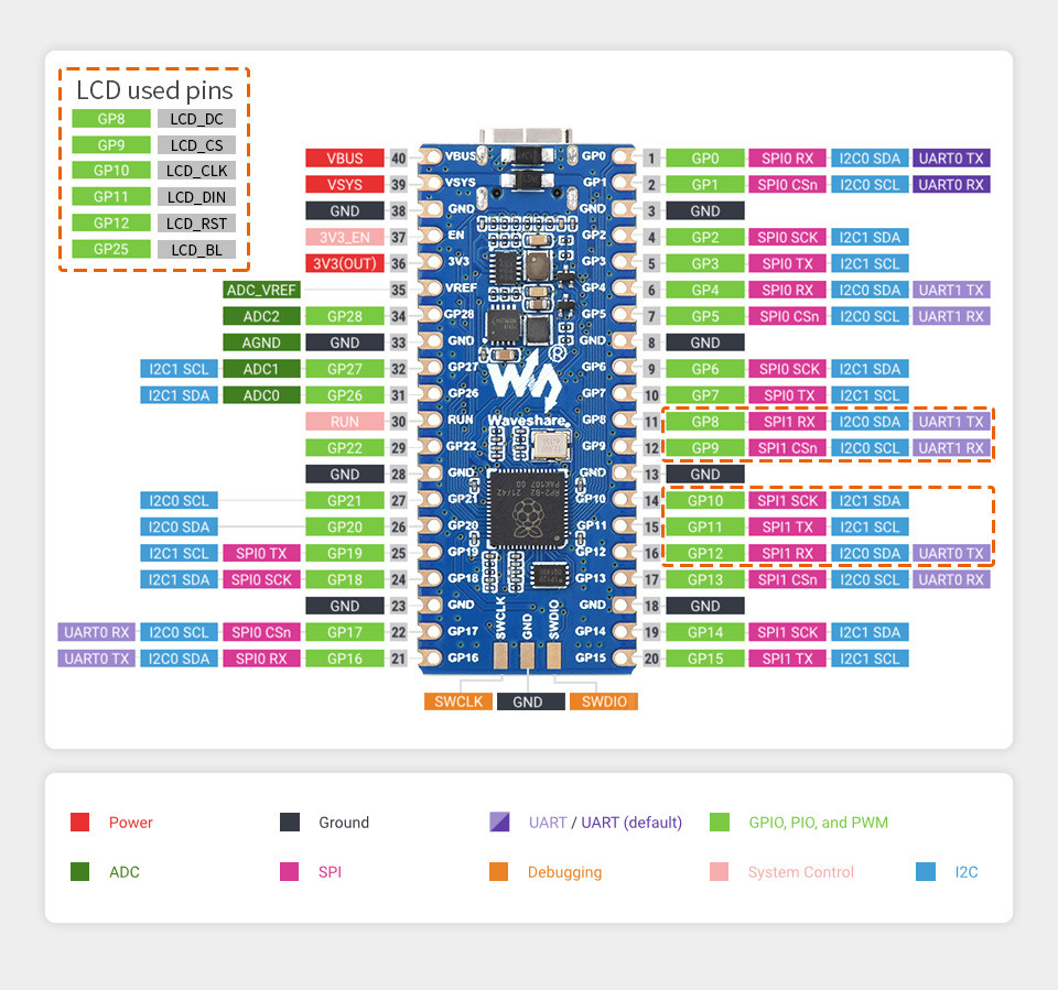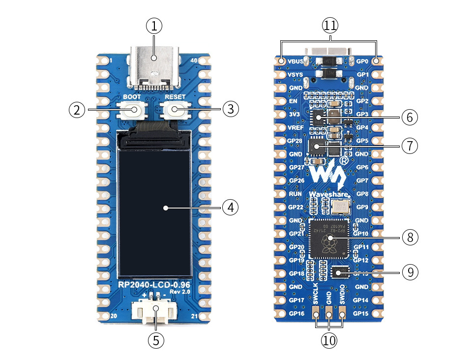 External pin mapping on the RP2040-LCD-0.96 is identical to the original Raspberry Pi Pico board, but note that internal RP2040 GPIO lines 23 and 24 are routed to the voltage regulator and USB connector for SMPS (TPS63000) power saving modes and USB VBUS sense. GPIO line 25 is routed to the on-board user LCD backlight and GPIO line 29 will be used for VSYS/3 voltage monitoring per default.