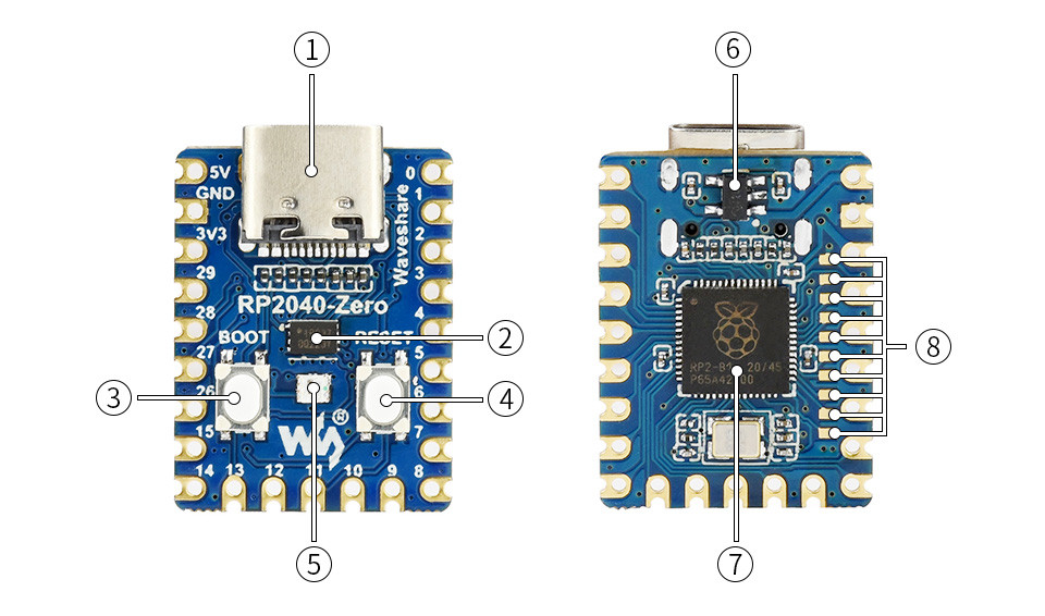 External pin mapping on the RP2040-Zero is not identical to the original Raspberry Pi Pico board. Almost all pins are rearranged in a more compact order. Likewise, the voltage sense and monitoring functions are not integrated. Thus all internal R2040 GPIO lines are available for free use, insofar there is sufficient space for them on the outer edge of the board or on the bottom side by additional solder points.