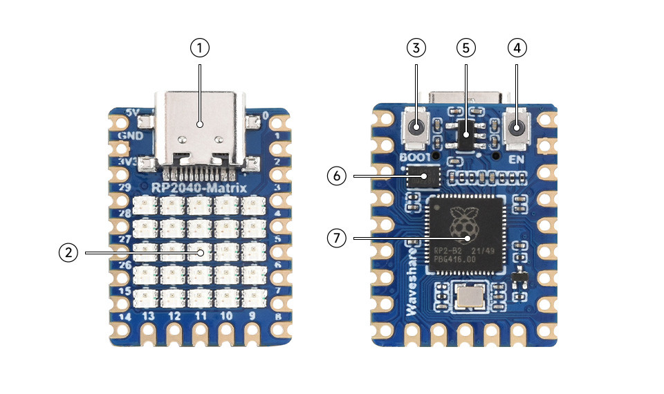 5V/300㎃ 3.3V/500㎃ 3.3V(OUT) 133㎒ 2㎆ 264㎅ RST RGB(5×5) LED(5×5) USB-C UF2 20 16 4 2 2 2