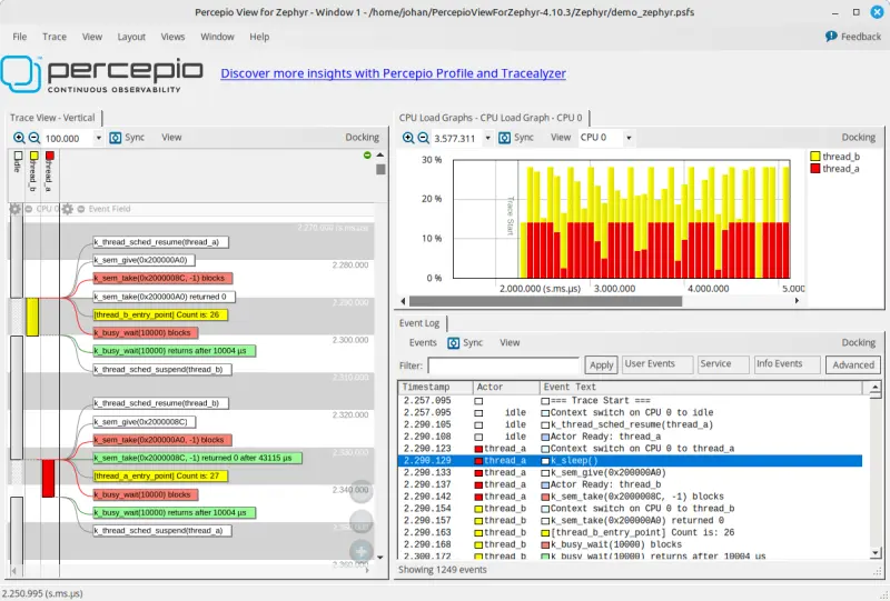 Zephyr includes support for Percepio Tracealyzer that offers trace visualization for simplified analysis, report generation and other analysis features. Tracealyzer allows for trace streaming over various interfaces and also snapshot tracing, where the events are kept in a RAM buffer.