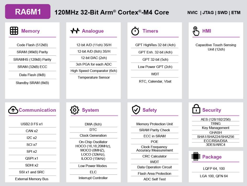 The Renesas RA6M1 microcontroller is the entry point to the Renesas RA6 product series for applications that require a high-performance Arm® Cortex®-M4 core at a very attractive price point. The RA6M1 is built on a highly efficient 40nm process and is supported by an open and flexible ecosystem concept—the Flexible Software Package (FSP), built on FreeRTOS—and is expandable to use other RTOSes and middleware. The RA6M1 is suitable for IoT applications requiring security, large embedded RAM and low power consumption.