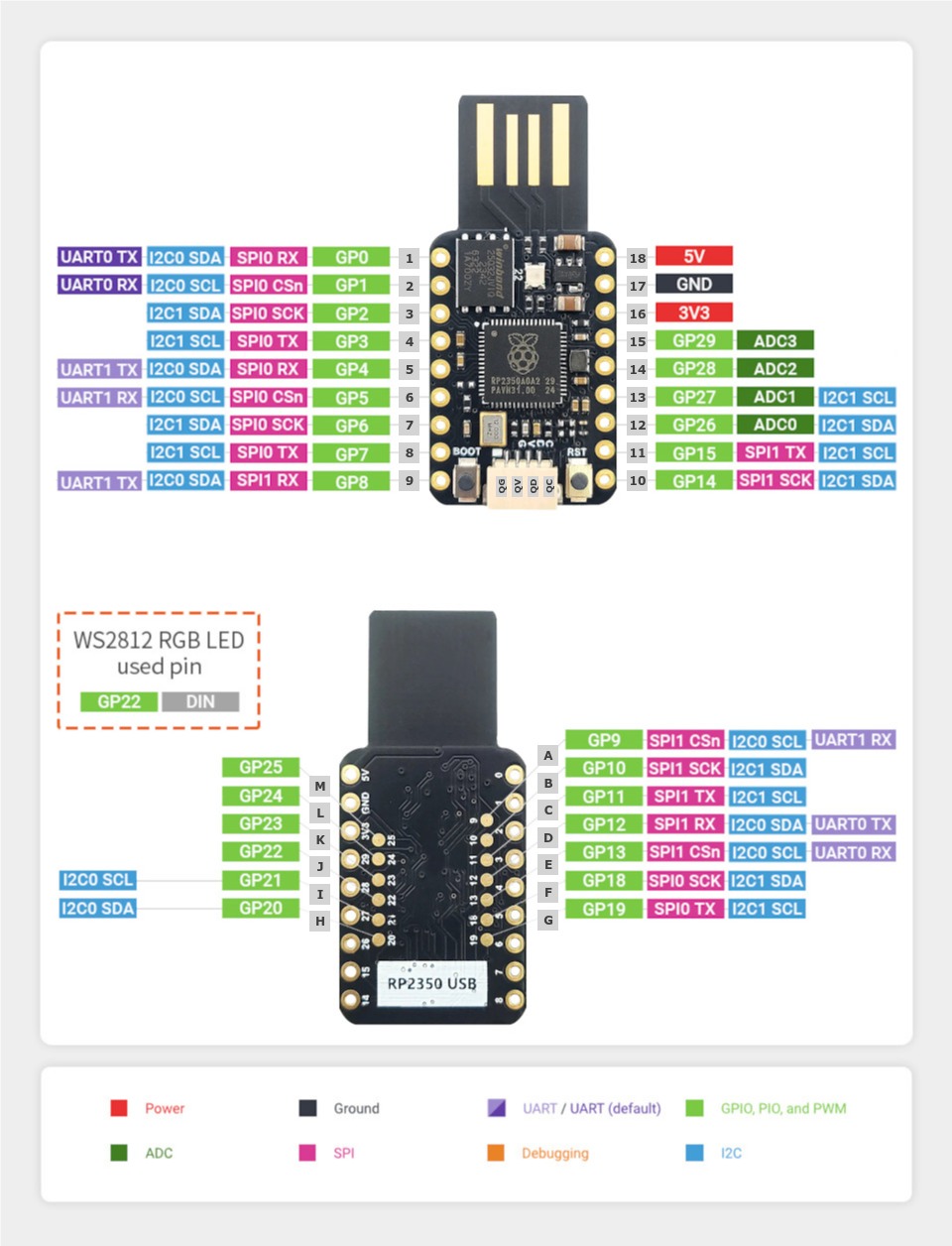 External pin mapping on the Mini USB RP2350 is not identical to the original Raspberry Pi Pico board. Almost all pins are rearranged in a more compact order. Likewise, the voltage sense and monitoring functions are not integrated. Thus all internal RP2350A GPIO lines are available for free use, insofar there is sufficient space for them on the outer edge of the board or on the bottom side by additional solder points.