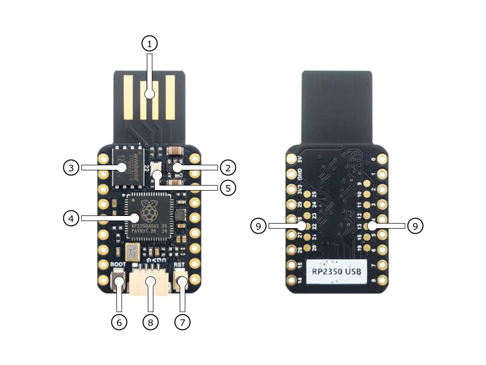 The Mini USB RP2350 [10] is a mini sized RP2350A development board. The on-board PCB USB-A connector makes it plug-and-play instantly. The castellated module allows soldering direct to carrier boards.