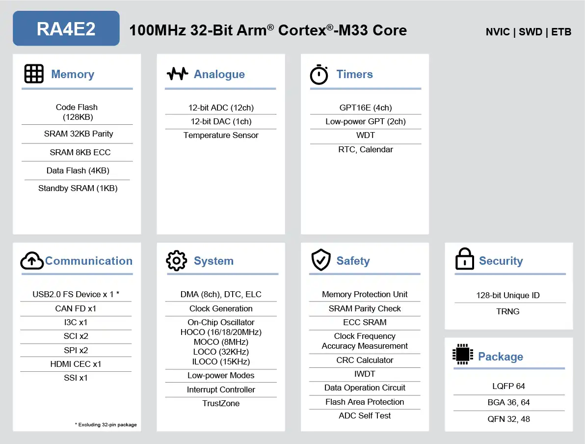 Detailed hardware features for the RA4E2 MCU group can be found at RA4E2 Group User’s Manual Hardware