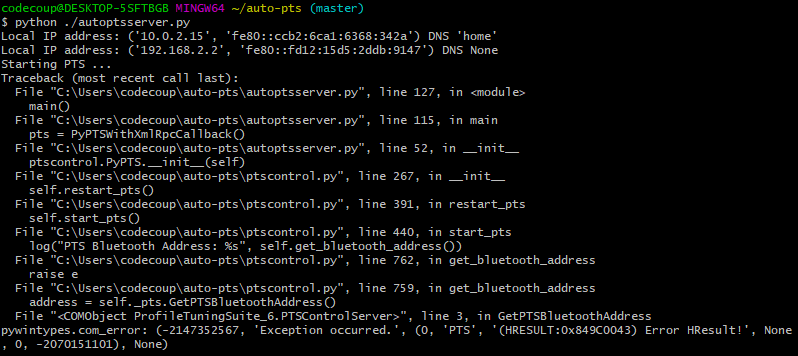 This indicates that it fails to capture a PTS dongle. If the AutoPTS server is able to find and use a PTS dongle, then the title of the window will show the Bluetooth address of the dongle. If this does not happen then ensure that the dongle is plugged in, updated and recognized by PTS.