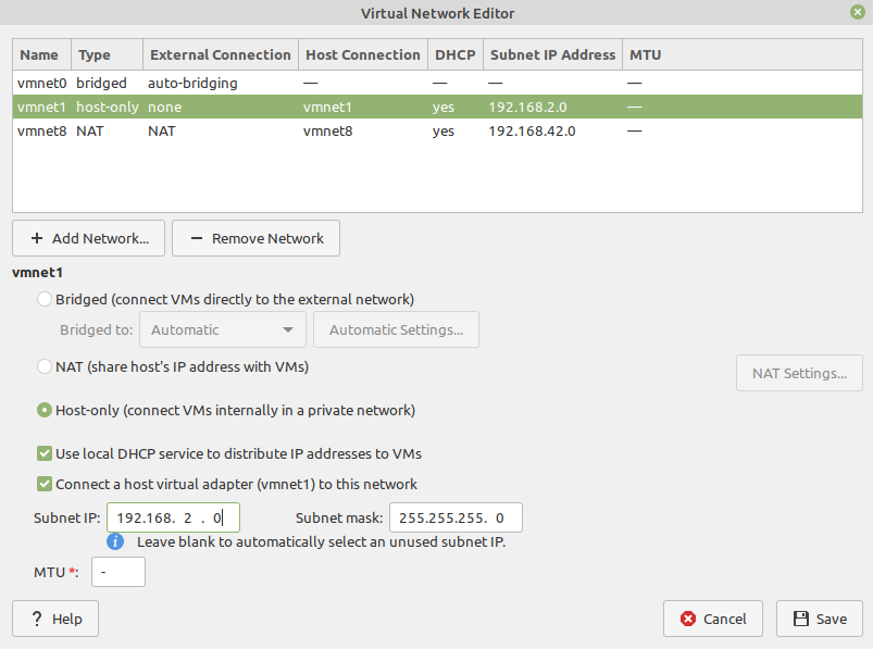 On Linux, open Virtual Network Editor app and create network: