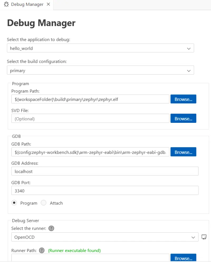 • Debug server/runner (OpenOCD, J-Link, LinkServer, pyOCD, …)